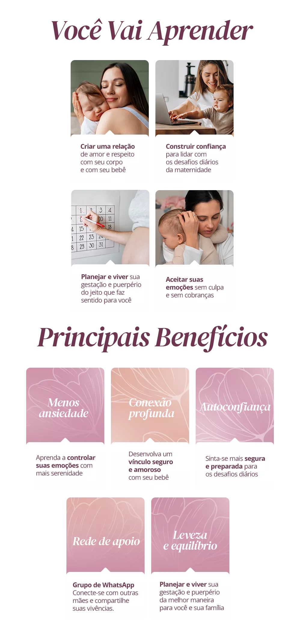 Nossas Mentorias foram desenvolvidas para ajudar você a viver sua Gestação e Puerpério de forma mais leve e equilibrada.